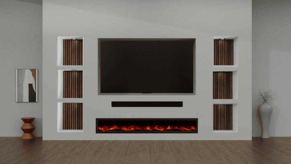 Aan beide zijden van de haard bevinden zich drie nissen die symmetrisch zijn uitgelijnd en voorzien van ingebouwde verlichting. De achterzijde van deze nissen is bekleed met WoodUpp panelen, die door hun akoestische eigenschappen niet alleen visueel warmte toevoegen, maar ook bijdragen aan een aangename geluidsdemping.