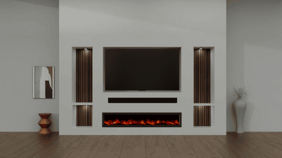 Onder de soundbar bevindt zich de exclusieve Trimline 150 elektrische haard. Deze haard biedt een diep en realistisch vlameffect met aanpasbare kleurtemperaturen, waardoor je de sfeer van de ruimte met één druk op de knop kunt veranderen.
