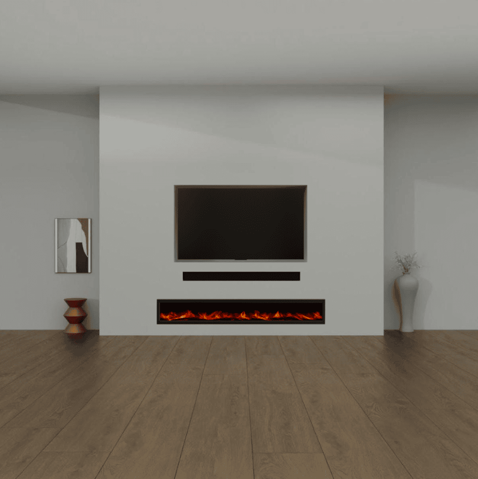 Onder de soundbar is de Aflamo 180 elektrische haard geplaatst. Deze haard staat bekend om zijn diepe vlameffect, realistische houtdecoratie en dimbare lichtintensiteit, waarmee je eenvoudig de gewenste sfeer in de ruimte creëert.