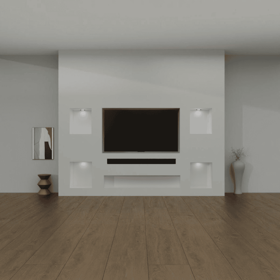 Pure is ontworpen voor liefhebbers van rust en eenvoud. Met een breedte tussen 250 en 350 centimeter en een hoogte tot 300 centimeter vormt deze cinewall een strak, evenwichtig geheel dat moeiteloos in verschillende interieurstijlen past. De 65 inch televisie wordt centraal ingebouwd, met daaronder een geïntegreerde soundbar in een speciaal ontworpen nis. Dit zorgt voor een perfecte balans tussen beeld en geluid, waarbij de techniek onzichtbaar is weggewerkt in de constructie.